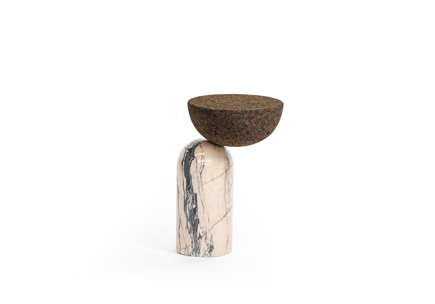 CELESTE side table, made up of a biodegradable cork agglomerate top, which rests on a cylinder of Estremoz marble from Alentejo, with a polished finish.