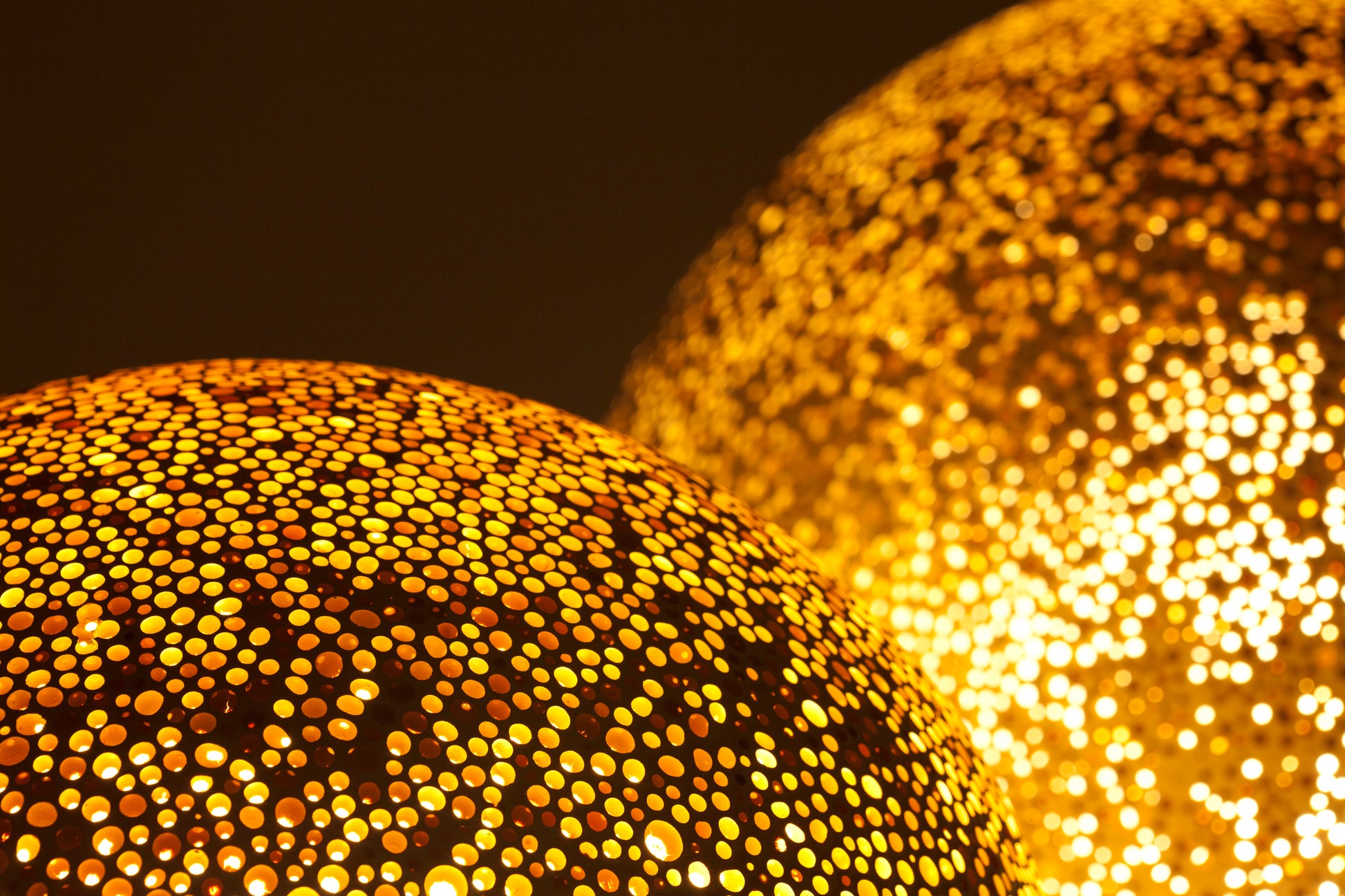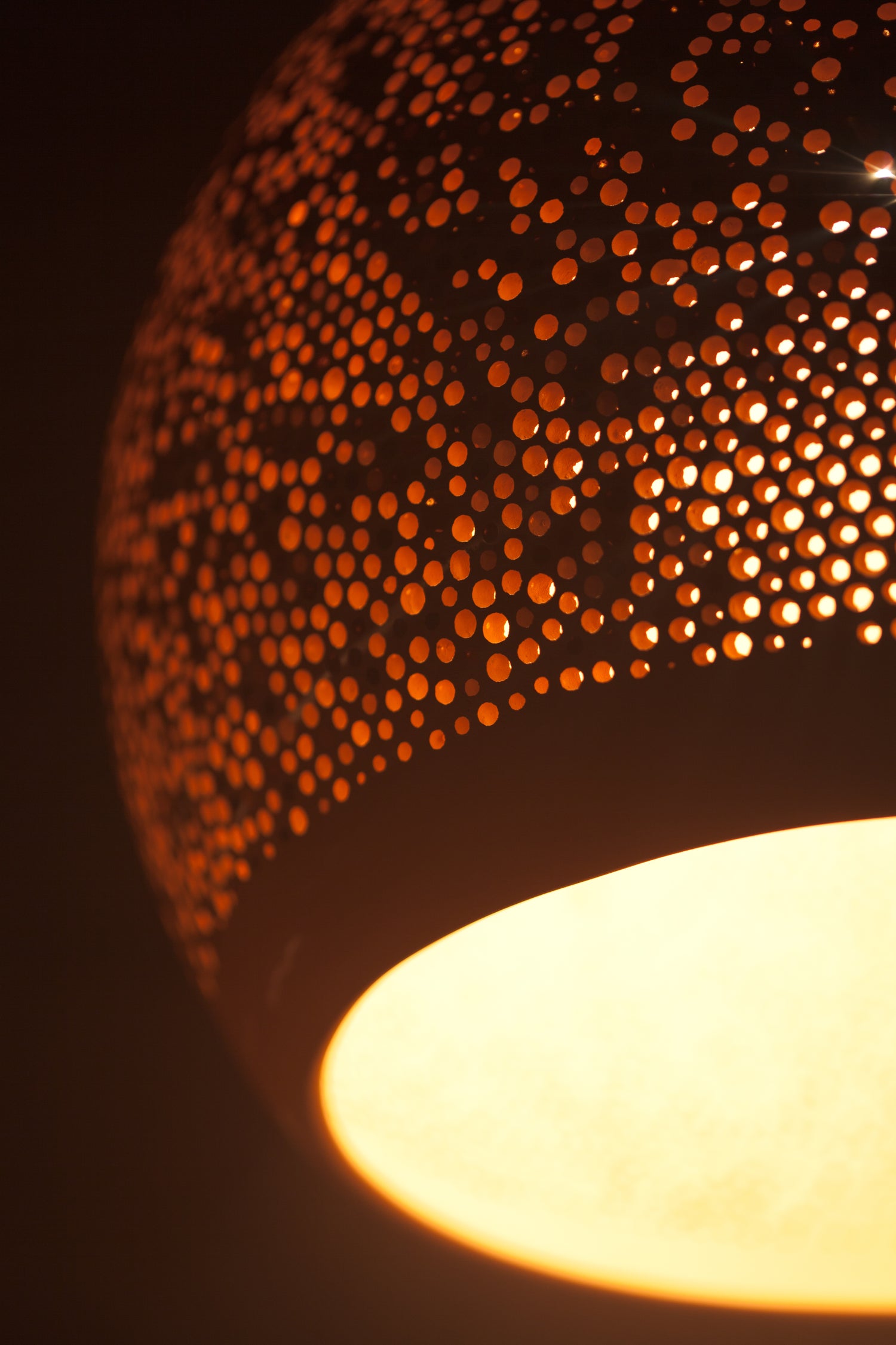 Quando a iluminação se acende, a peça ganha vida. A luz emerge do interior como uma constelação íntima, criando uma atmosfera suave, quase celeste, que envolve o espaço sem o dominar.