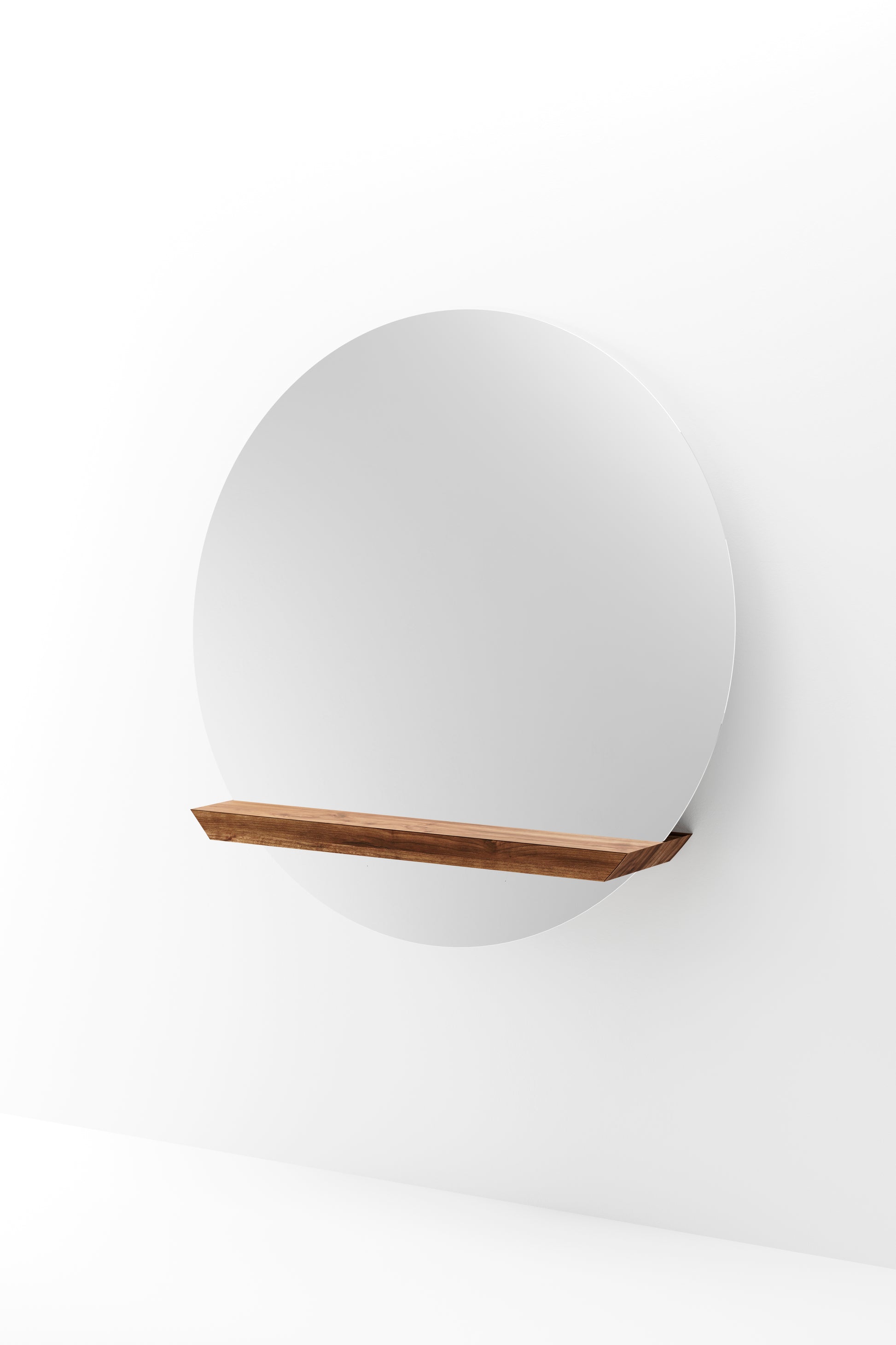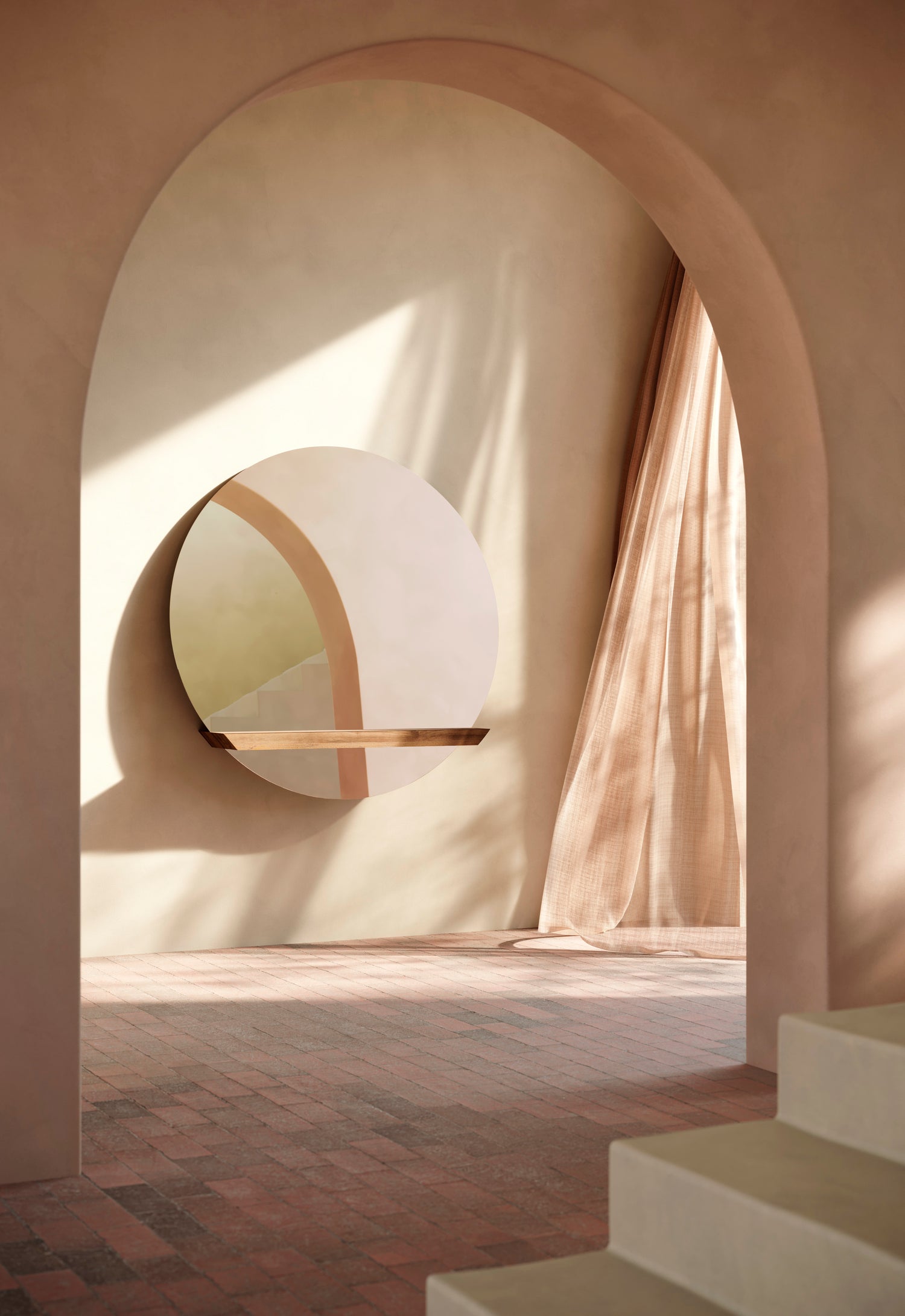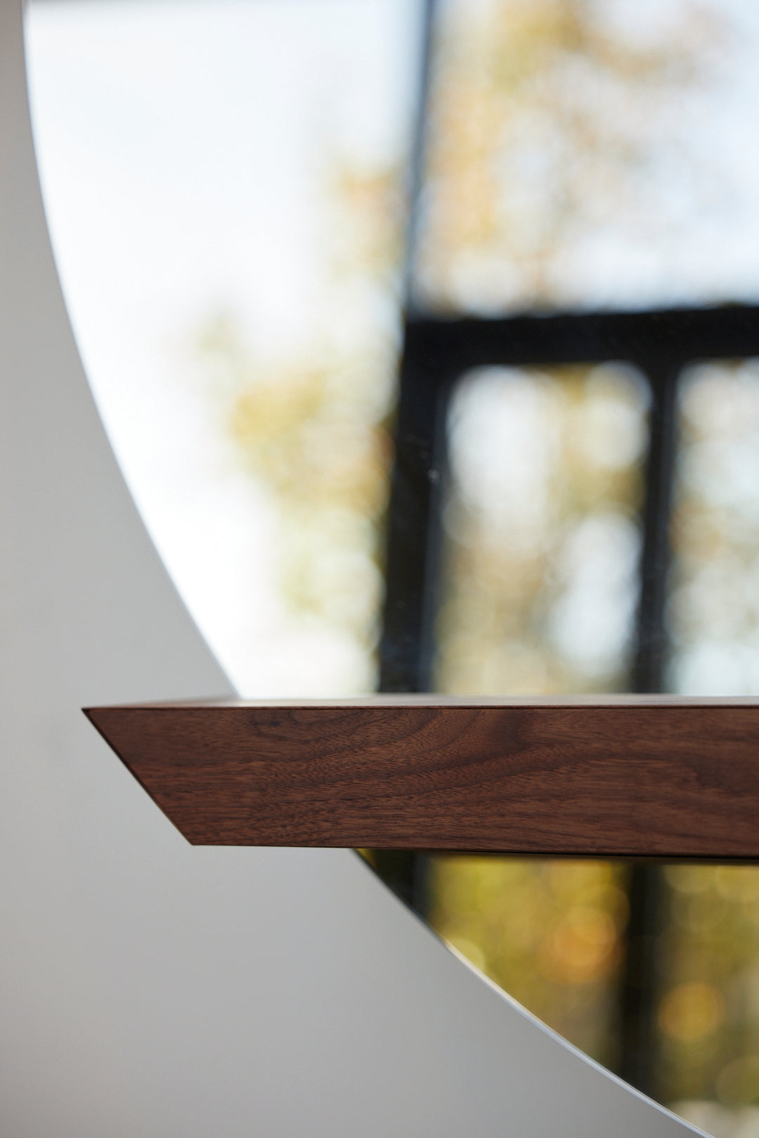 No coração do hall de entrada, cada detalhe conta. O espelho Guillotine é mais do que um simples acessório: é uma peça que combina beleza e funcionalidade com delicadeza. O seu espelho redondo funde-se visualmente com a gaveta em nogueira ou carvalho natural, criando uma linha contínua que transmite harmonia e elegância.