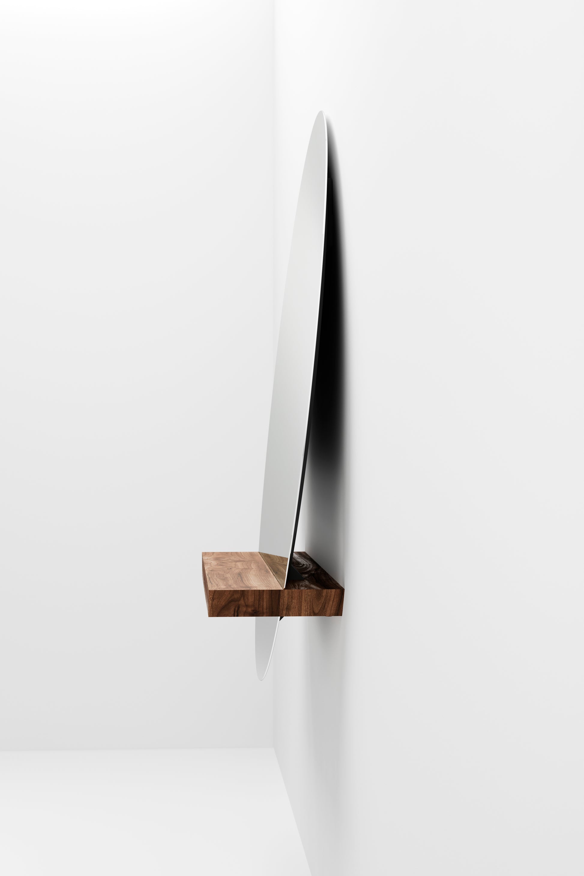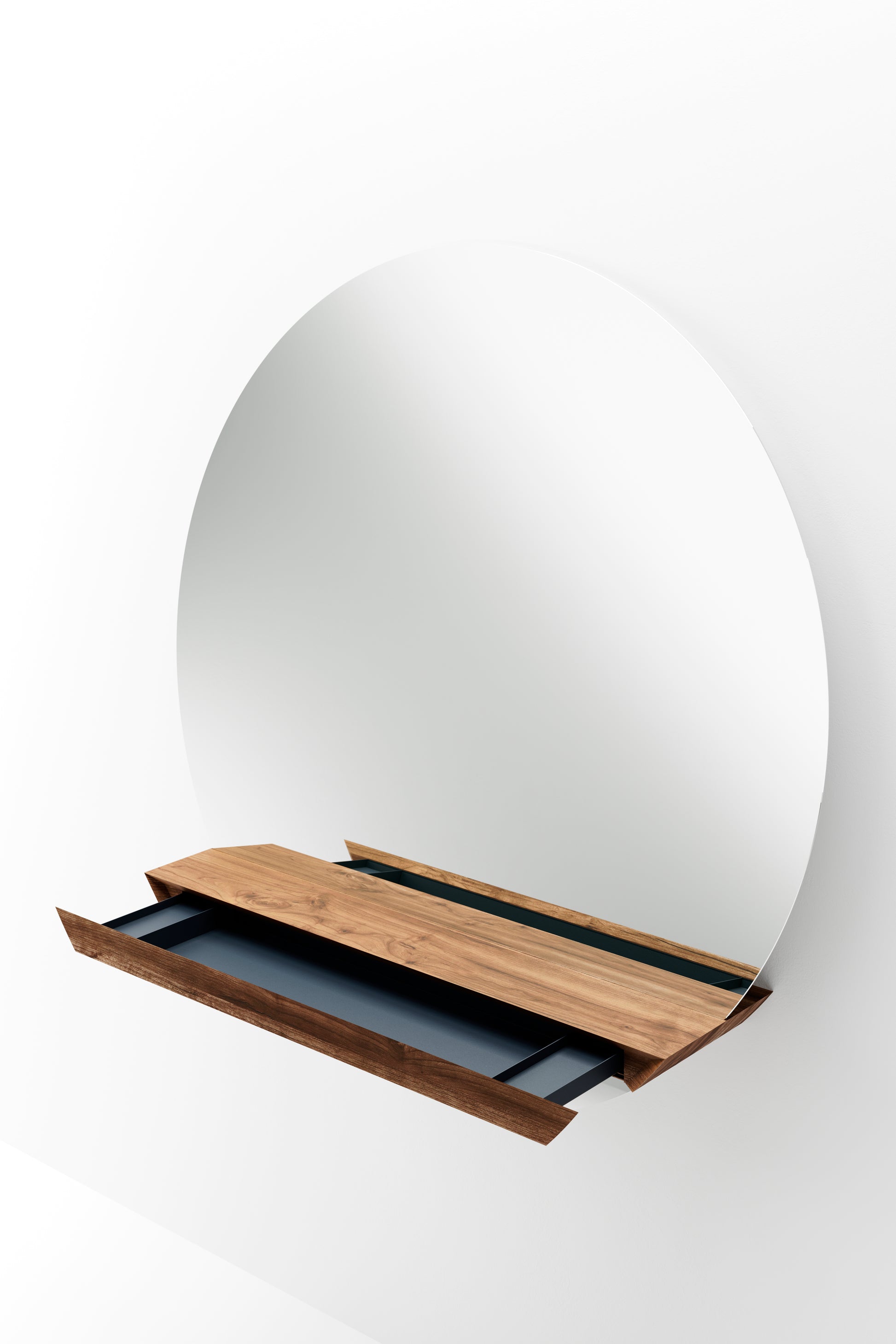 O espelho de parede funde-se visualmente com a gaveta em nogueira ou carvalho natural certificado FSC proveniente de florestas sustentáveis, forrada a couro, oferecendo espaço discreto para guardar chaves, carteira e pequenos objetos.